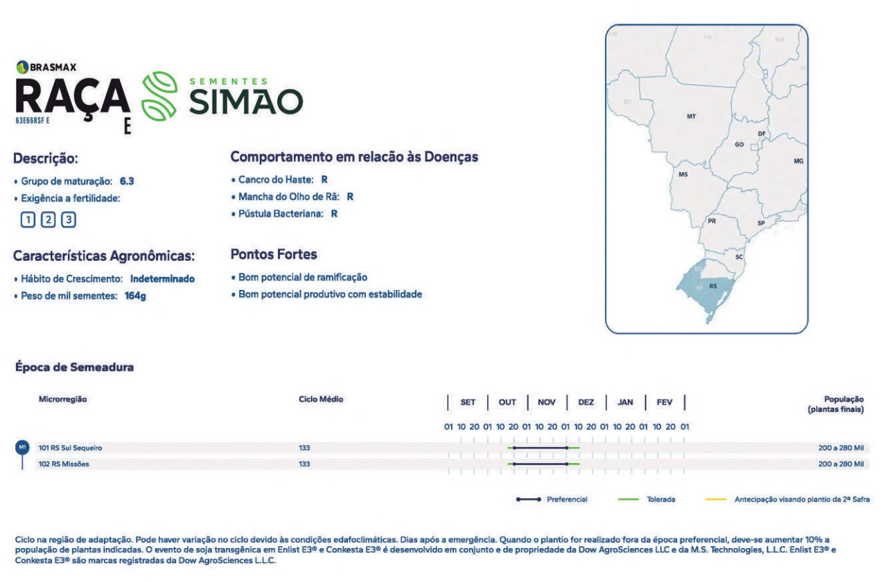 A cultivar RAÇA E apresenta desempenho equilibrado, com foco em estabilidade produtiva e bom potencial de ramificação, sendo indicada para diferentes condições de cultivo.