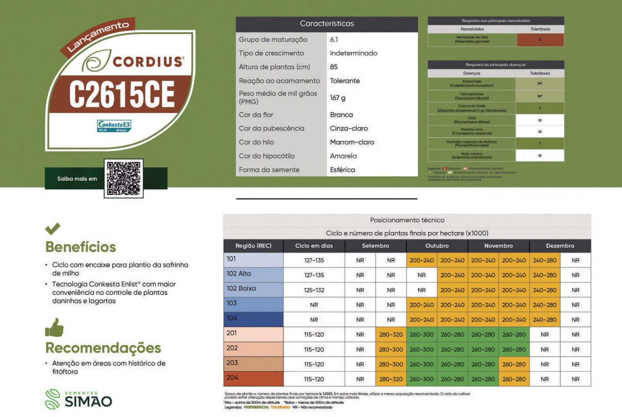 A cultivar CORDIUS C2615CE é uma opção moderna com tecnologia avançada, oferecendo bom desempenho produtivo, adaptação a diferentes ambientes e eficiência no manejo de plantas daninhas e pragas.