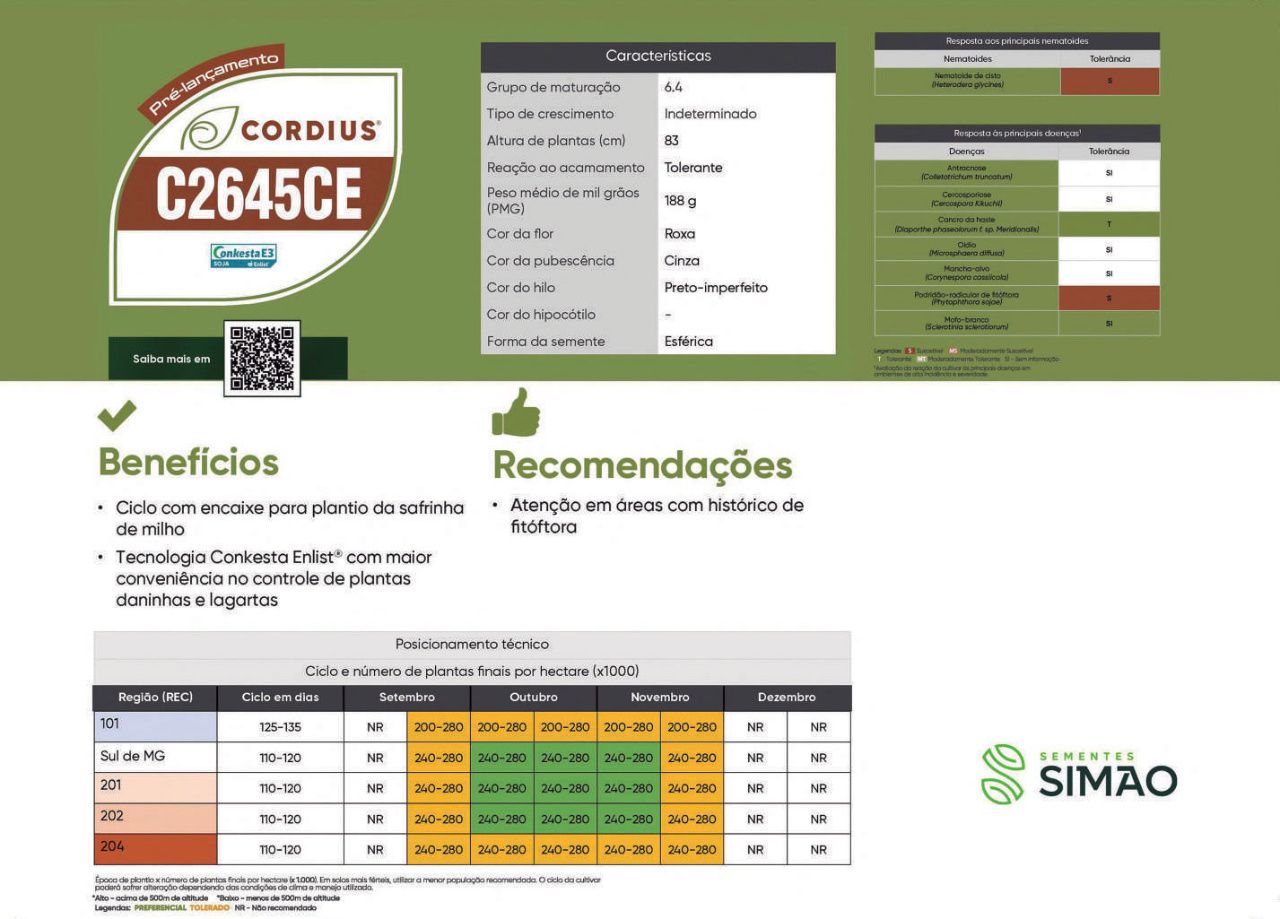 A cultivar CORDIUS C2645CE apresenta alto potencial produtivo aliado à tecnologia moderna, com boa adaptação a diferentes ambientes e eficiência no manejo de plantas daninhas e pragas.