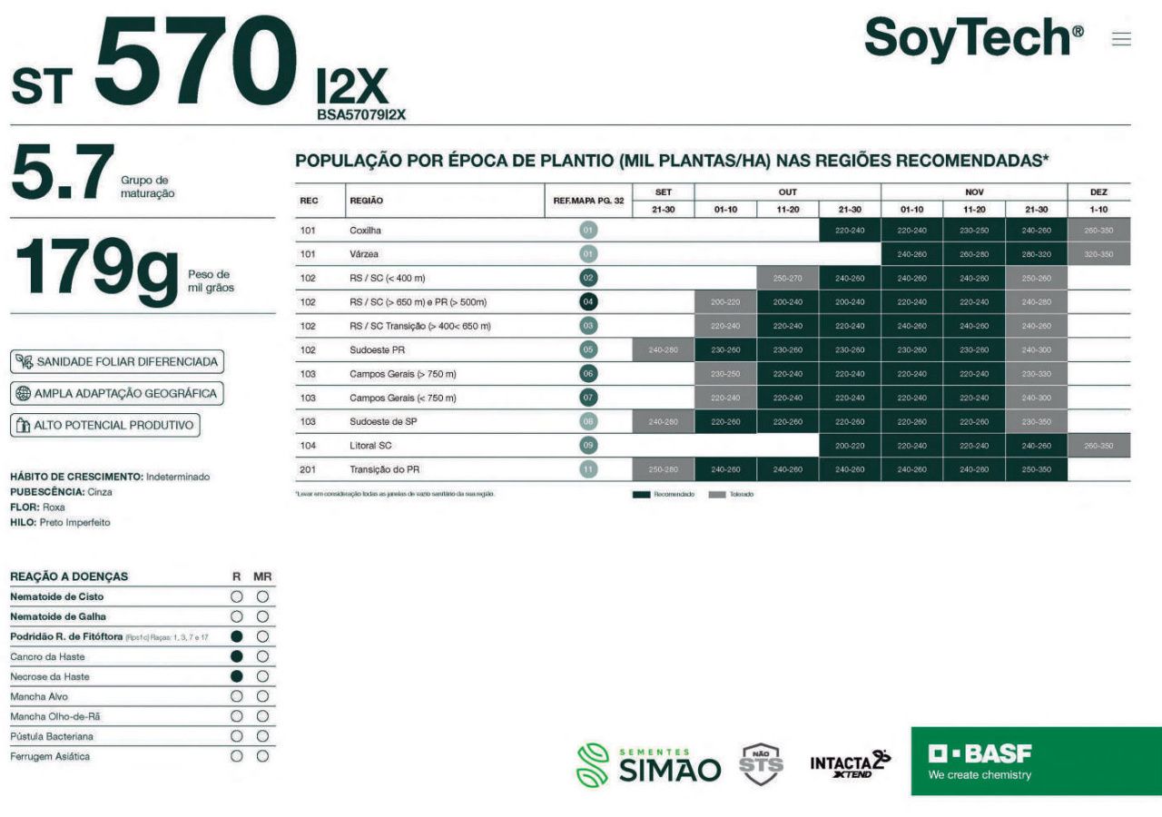 A cultivar ST 570 I2X, desenvolvida pela marca SoyTech, apresenta um conjunto de características voltadas para alta produtividade e ampla adaptação geográfica.
